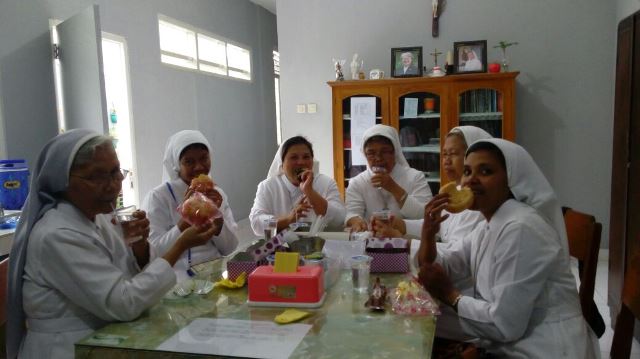 Suasana kebersamaan di komunitas Santo Mikael setelah mengikuti misa syukur pesta pelindung sekolah SMA St. Mikael Warak.