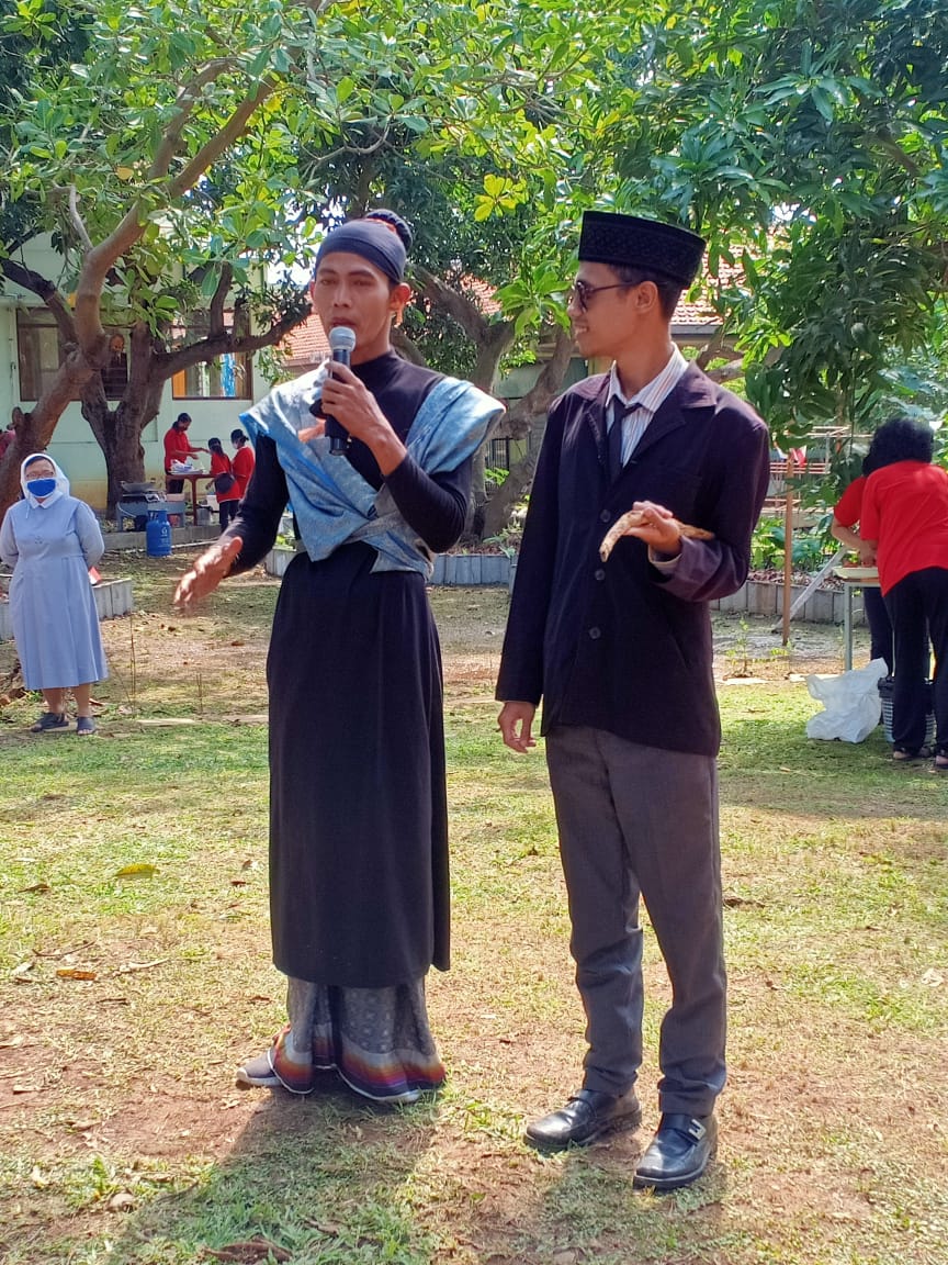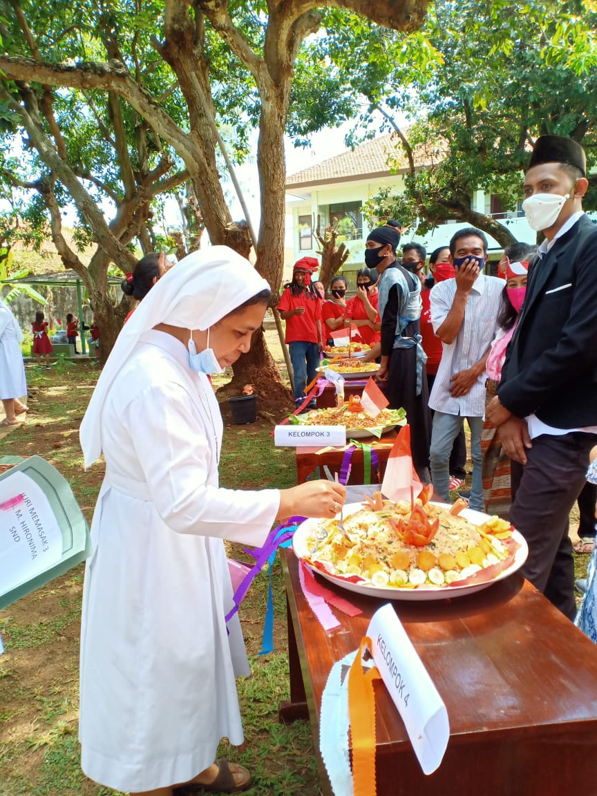 Para suster merayakan Ulang Tahun Kemerdekaan bersama para karyawan dengan mengadakan upacara bendera pada pukul 07.30 di halaman depan susteran, dan Sr. Maria Robertin, SND sebagai inspektur upacara. Dalam wejangannya ia menghimbau seluruh karyawan untuk mengalami sukacita Kemerdekaan Republik Indonesia yang ke-75 dengan hati yang merdeka, pikiran yang merdeka dan saling menghargai satu sama lain. “ Kita sebagai satu keluarga, satu ibu pertiwi, satu pemikiran, untuk bekerja bersama demi kemajuan bersama.” Ungkap suster Maria Robertin SND pemimpim komunitas Rumah Induk Pekalongan. Setelah upacara bendera, dilanjutkan dengan beberapa perlombaan antara lain: Lomba memasukan gunting didalam botol, lomba memasak nasi goreng dan lomba Fashion show dengan memperagakan para pahlawan Kemerdekaan Republik Indonesia. Dalam acara perlombaan ini karyawan dibagi dalam 4 kelompok dan beberapa suster diminta untuk menjadi juri dalam perlombaan tersebut. Tentunya kami mengadakan perlombaan ini dengan tetap memperhatikan protocol kesehatan seperti menjaga jarak, mencuci tangan dan menggunakan masker.